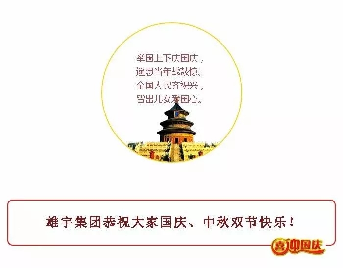 值此佳節(jié)來(lái)臨之際,雄宇集團(tuán)祝愿大家:國(guó)慶、家慶、普天同慶;官源、財(cái)源、左右逢源;人緣、福緣、緣緣不斷;情愿、心愿、愿愿隨心。