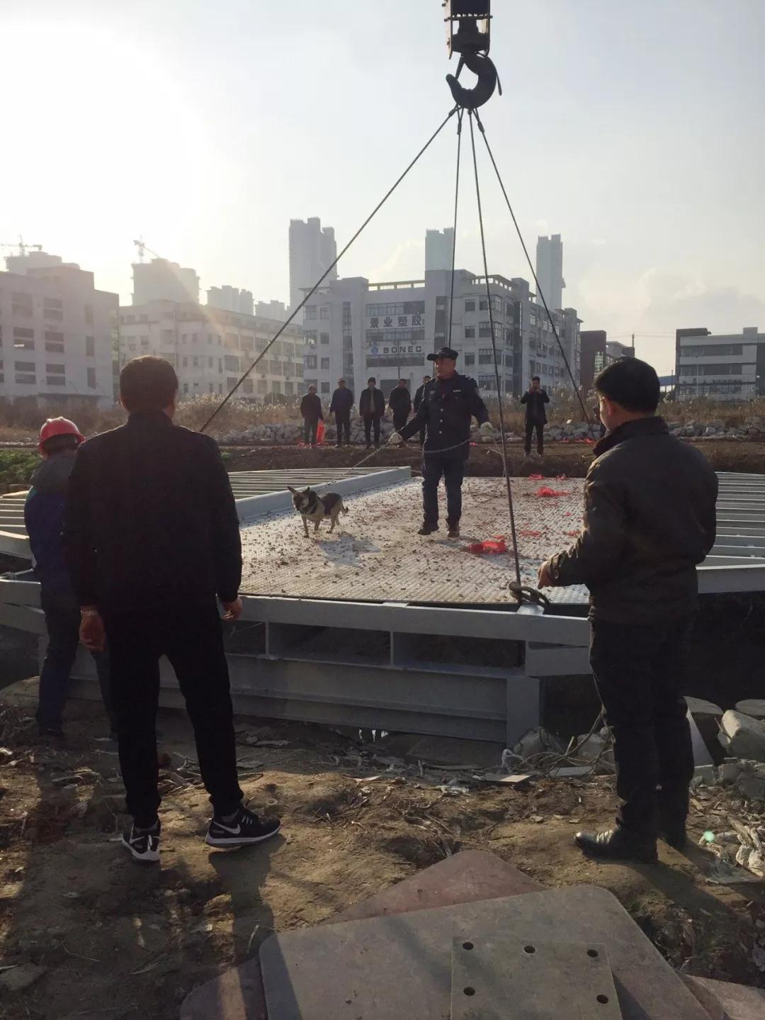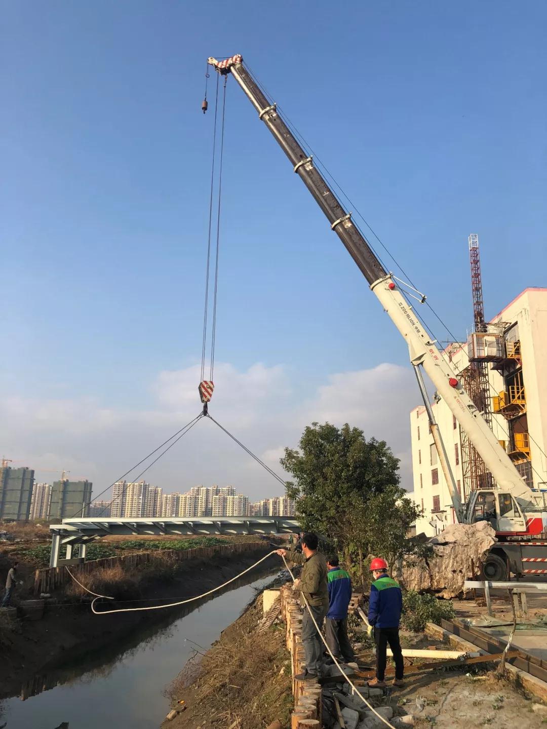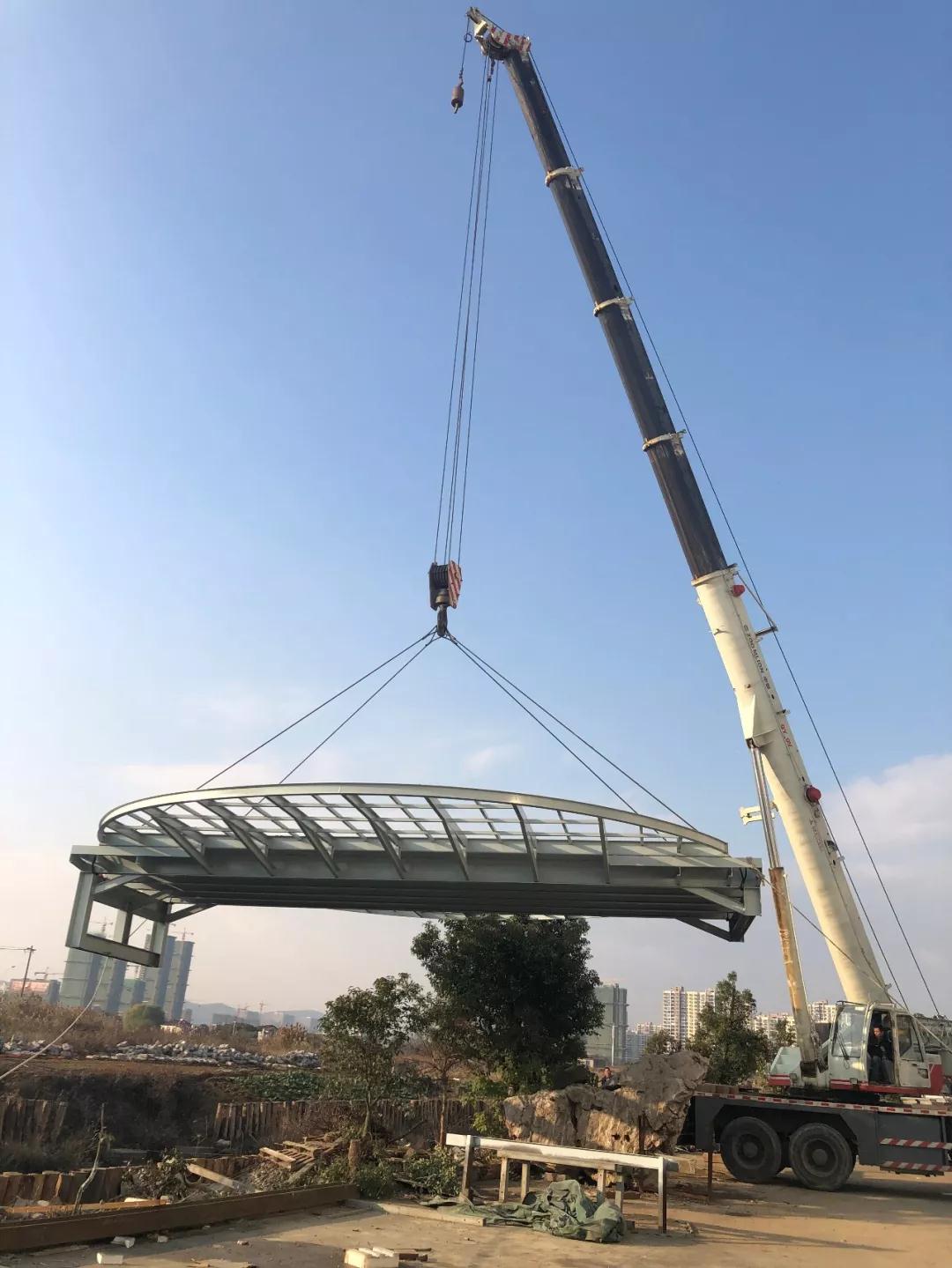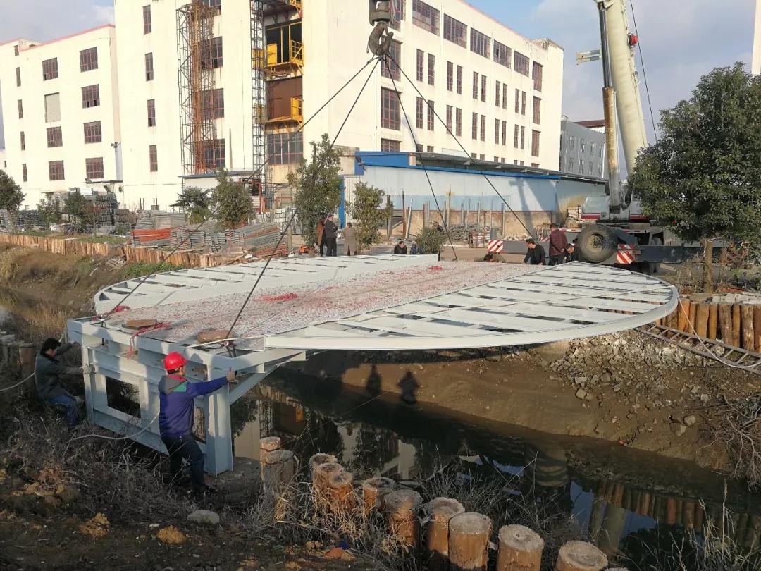 雄宇聯(lián)誼大橋是雄宇集團(tuán)自主研發(fā)設(shè)計(jì)的一座供人員出行與休閑觀光的多功能鑲梁式鋼結(jié)構(gòu)大橋。從高空俯瞰,大橋呈圓形,直徑10.6米,中間人行道寬四米,大橋兩側(cè)的扇形單邊懸挑達(dá)3.3米,猶如雄鷹展翅。橋面自重12噸,大橋橋面由載重80噸的起重機(jī)起吊,起重機(jī)的四根鋼絲繩牢牢扣住在橋面上的四個(gè)懸掛點(diǎn)上,隨著一聲起吊指令,橋面整體緩慢平移到橋墩上方,在牽引繩的幫助下,橋面平穩(wěn)地坐落在在四個(gè)鋼筋混凝土墩柱上,橋身上下對接準(zhǔn)確,嚴(yán)絲合縫,整座大橋穩(wěn)如泰山。