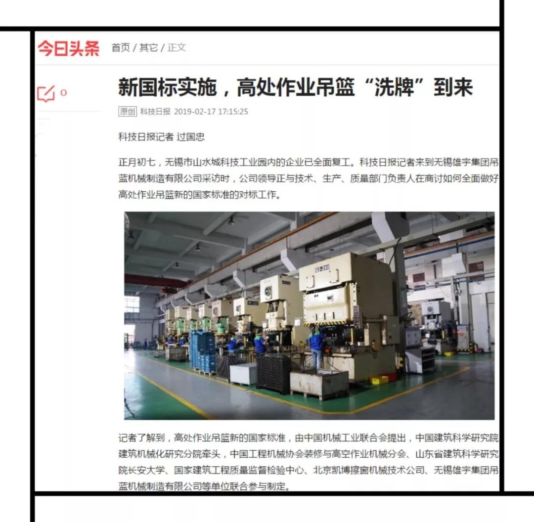 2019年2月17日,科技日報以《新國標(biāo)實施,高處作業(yè)吊籃“洗牌”到來》為題,全面報道了雄宇吊籃在新國標(biāo)頒布后所取得的系列創(chuàng)新成果,高度評價了雄宇吊籃在業(yè)界的影響力。