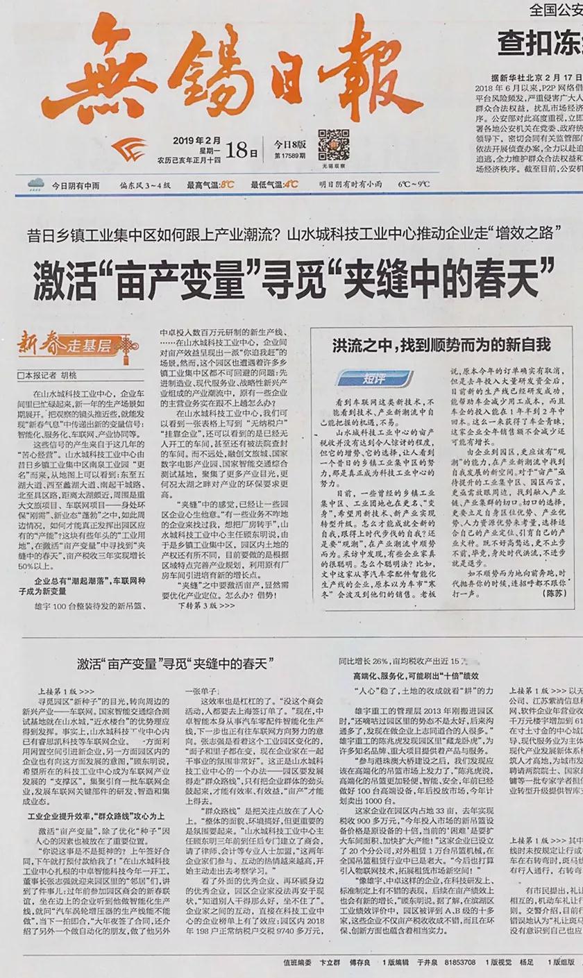 無錫日報 2019年2月18日 頭版頭條