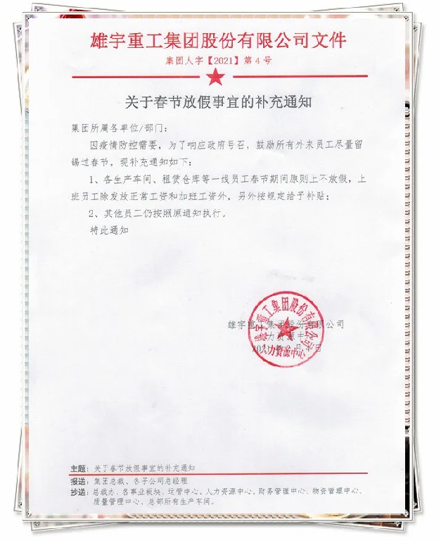 春節(jié)期間,為響應(yīng)政府號召,鼓勵大家就地過年,經(jīng)集團行政人事部、集團工會及職工代表充分協(xié)商,決定春節(jié)期間原則上不放假,號召大家“非必要不返鄉(xiāng)”,并就春節(jié)放假事宜發(fā)了補充通知,詳細規(guī)定了職工在節(jié)日期間加班的工資待遇和補貼標(biāo)準(zhǔn)。