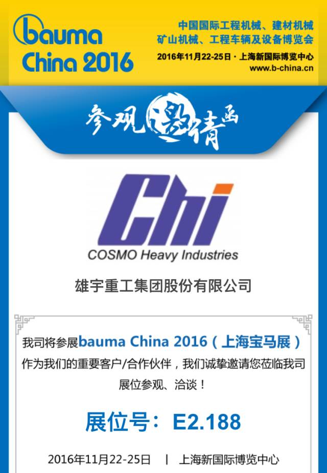 2016年11月22-25日中國工程機械、建材機械、礦山機械、工程車輛及設備博覽會(簡稱“上海寶馬展”)將在上海新國際博覽中心舉辦。